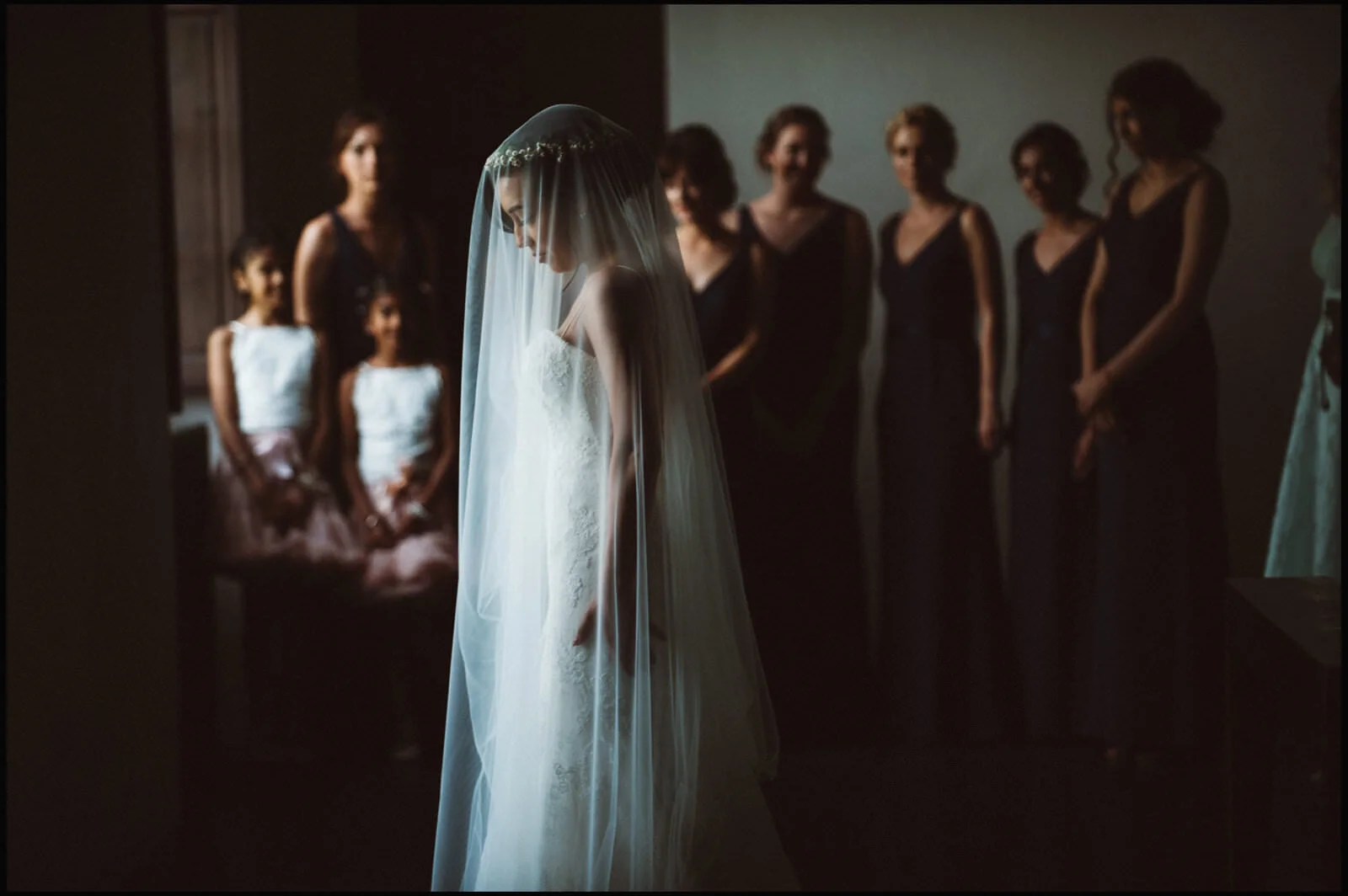 A bride in a white wedding dress and veil stands with her head bowed, surrounded by women in black dresses and two young girls in white tops and pink skirts, in a dimly lit room.