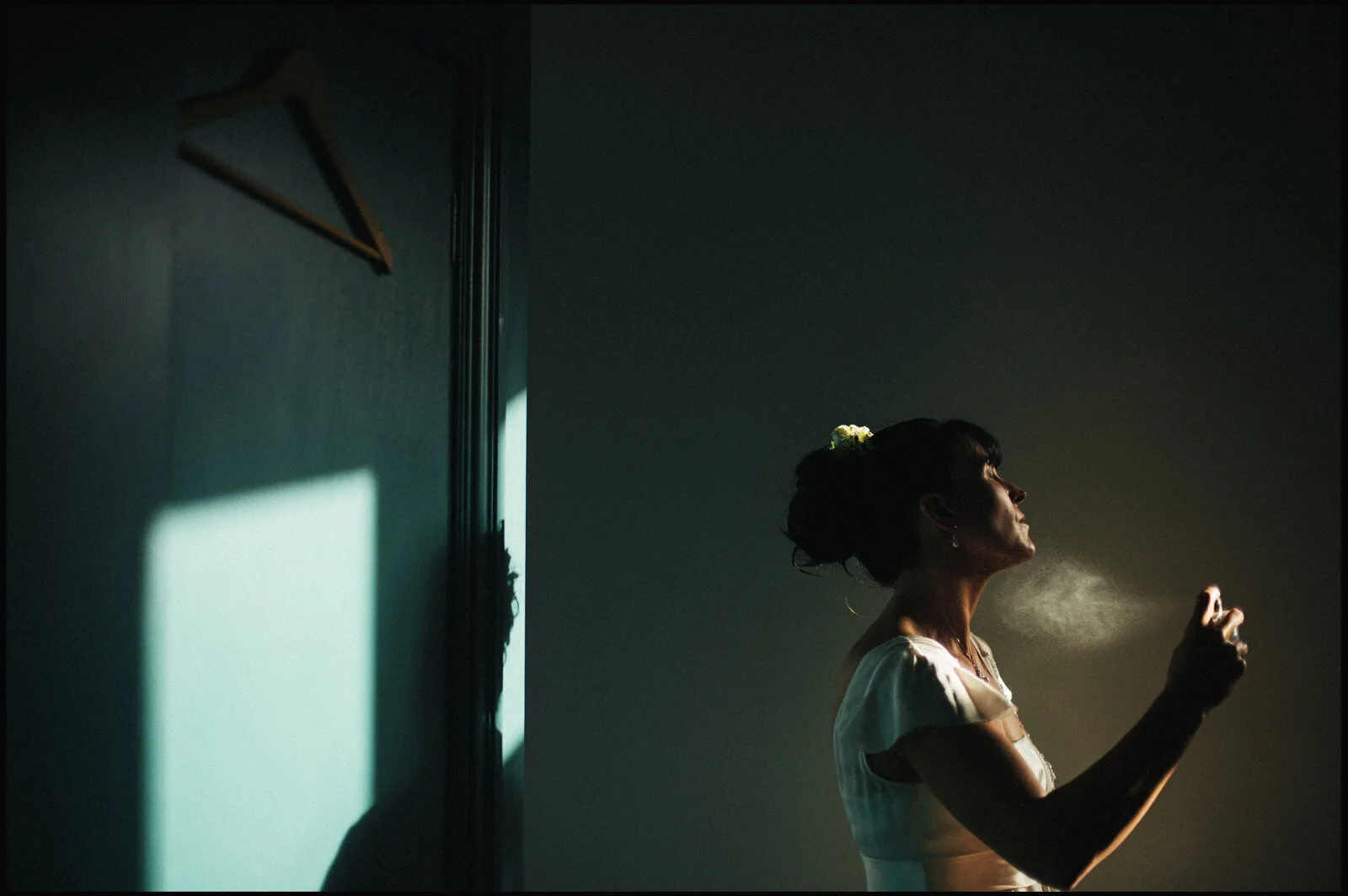 Woman in white dress standing in a dimly lit room, with sunlight casting shadows on the wall behind her, holding a spray bottle near her face.